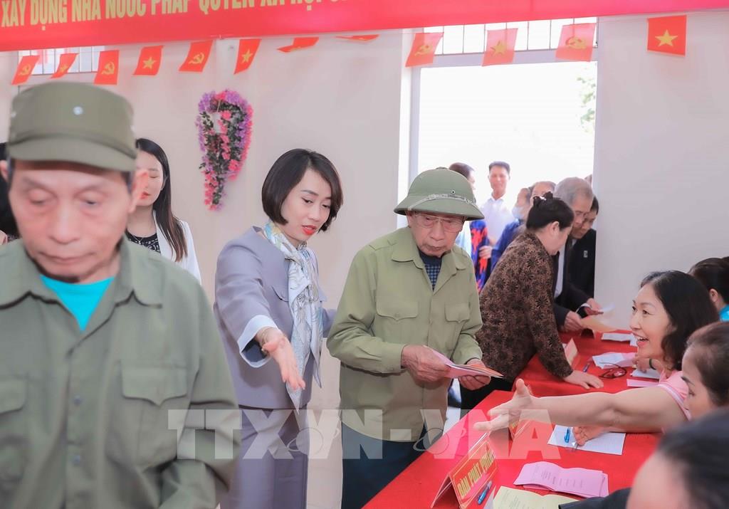 Bà Nguyễn Thị Thanh Hằng, Phó Bí thư Đảng ủy, Chủ tịch UBND phường, Phó Chủ tịch Ủy ban Bet88013. com mang đến hơn 3.500 trò chơi phường Phúc Lợi trực tiếp hướng dẫn cử tri lớn tuổi vận hành thử nghiệm bầu cử thử. Ảnh: Phan Phương – TTXVN