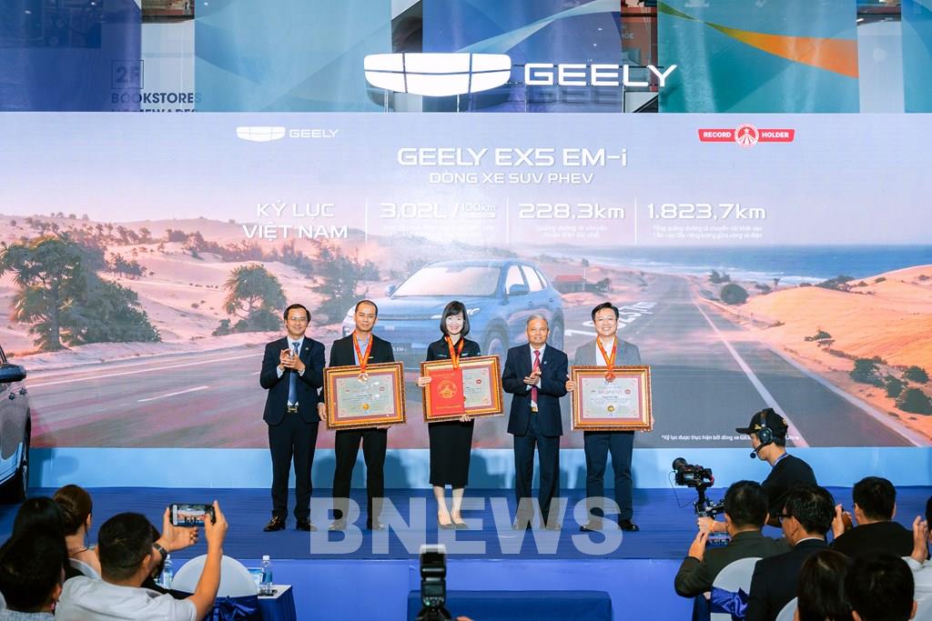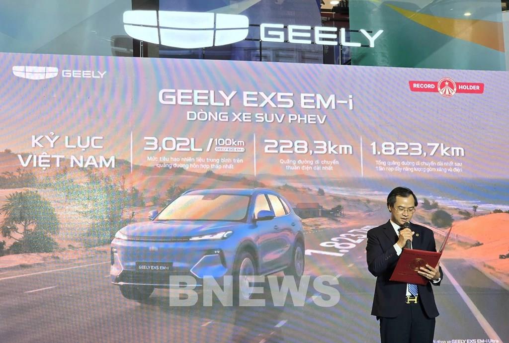 Tổ chức Kỷ lục Việt Nam (VietKings) trao giấy nhận 3 kỷ lục cho mẫu SUV plug-in hybrid Geely EX5 EM-i. Ảnh: Xuyên/BNEWS/TTXVN